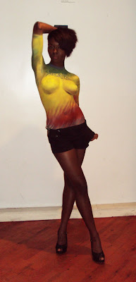 A sexy body painted model with the Ethiopian National colors, the AfroSonic (sponsor) logo and body painted bling.